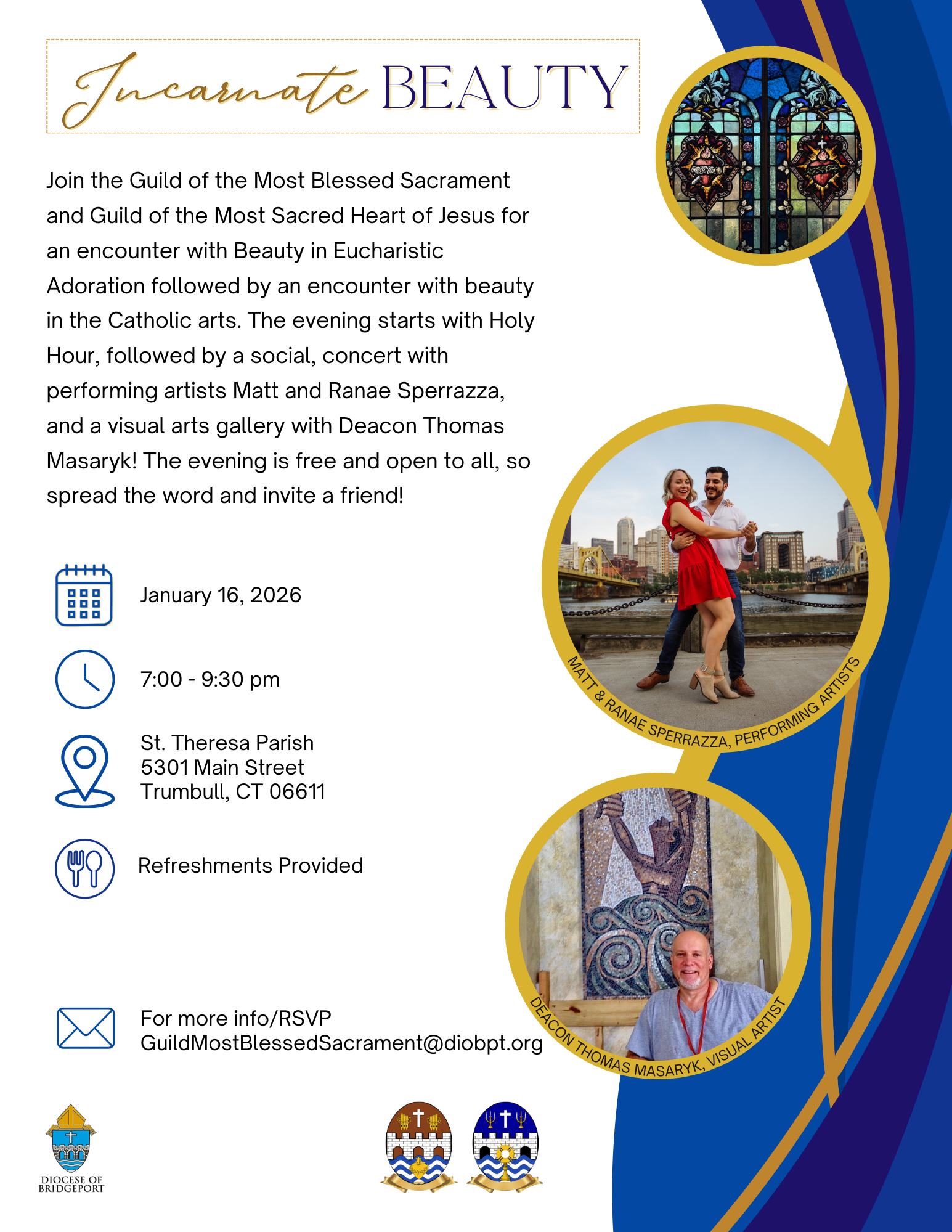 INCARNATE BEAUTY AT ST. THERESA IN TRUMBULL: Join us Friday, January 16th for the next “Incarnate Beauty” Holy Hour with the Guild of the Most Blessed Sacrament and the Guild of the Most Sacred Heart. Encounter Christ in Eucharistic Adoration, fellowship and the Catholic arts. The evening includes a beautiful Holy Hour followed by a time of fellowship, music with our featured Catholic performing artists, Matt & Ranae Sperrazza, and art by our featured visual artist, Deacon Tom Masaryk. Spread the word and invite a friend and come encounter Christ in beauty! Please see the attached poster.